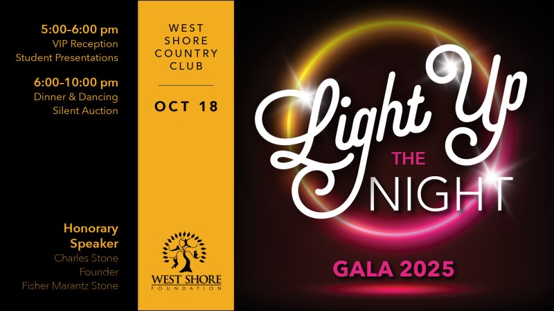 It's time to spotlight and celebrate all the great things that are happening in the West Shore School District at our 10th Annual Gala! This year's theme is Light Up the Night! It is our major fundraising event each year. We are proud to support the students, faculty, and staff in the areas of Academics, Arts & Culture, Athletics, Innovation, and Community Wellness.
